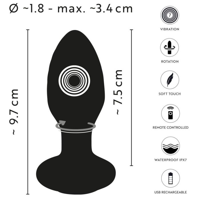 Der RC Rotating Butt Plug bietet Ihnen eine Vielzahl von 7 abwechslungsreichen Vibrations- und Rotationsmodi, die sich einfach per Knopfdruck am Stopper oder über die praktische Fernbedienung steuern lassen. Mit einer Reichweite von bis zu 6 Metern können Sie oder Ihr Partner die Kontrolle übernehmen und die tiefgehenden Rhythmen nach Belieben anpassen oder kombinieren. Die Soft Touch Textur sorgt für ein angenehmes Tragegefühl, während der breite Stopper für Sicherheit und Komfort sorgt, sodass auch längeres Tragen problemlos möglich ist. Mit einer Gesamtlänge von 9,7 cm und einem maximalen Durchmesser von 3,4 cm ist dieser anal Plug perfekt für alle, die auf der Suche nach neuen Höhepunkten der Lust sind.
