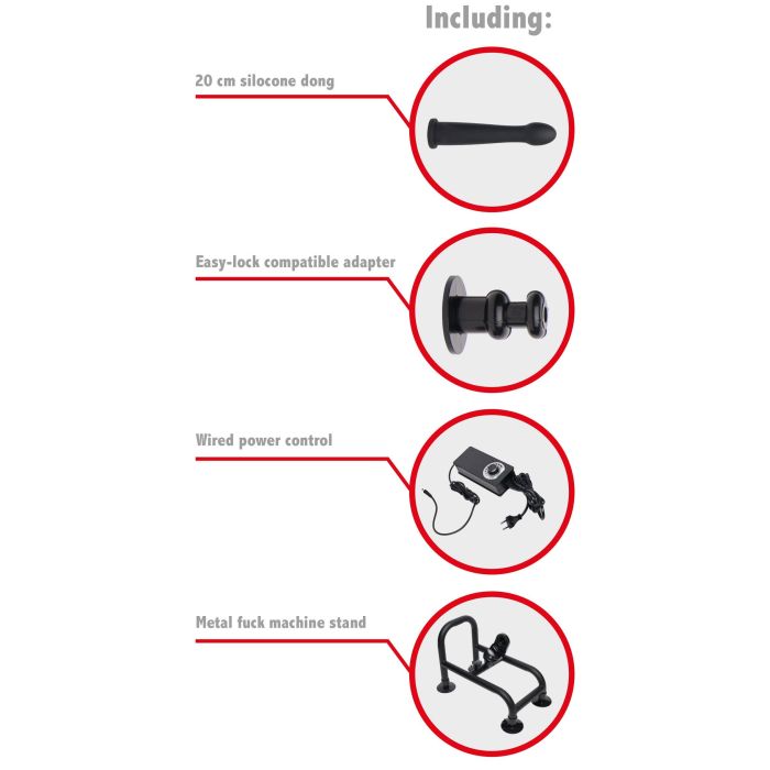 Zur Bangers Fuck Machine wird ein Silikon-Dildo von 20 cm geliefert, sodass du direkt loslegen kannst. Zusätzlich wird auch ein einfacher Adapter mitgeliefert, sodass du die Maschine leicht an die Steckdose anschließen kannst. Mit der verkabelten Leistungsregelung kannst du ganz einfach die Geschwindigkeit und Intensität der Stöße an deine Vorlieben anpassen. Um die Maschine in einer bequemen Höhe zu nutzen, wird auch ein Metallständer mitgeliefert.