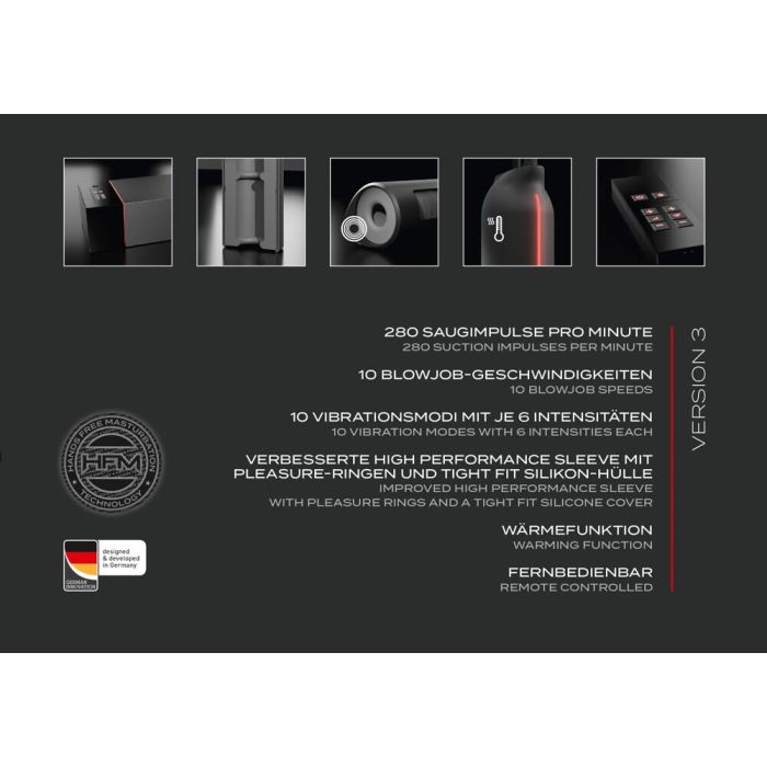 Der leistungsstarke Motor erreicht Geschwindigkeiten von bis zu 280 U/min und wird von einem zuverlässigen AC-Netzadapter für maximale Leistung gespeist. Der diskrete rote LED-Streifen pulsiert im Takt der Aktion, sodass du visuell miterleben kannst, ohne dass es im Raum auffällt. Der Suck-O-Mat 3 wird standardmäßig mit einem L-Ärmel geliefert, ist aber auch mit den Größen M und XL kompatibel, sodass du immer die perfekte Passform wählen kannst.