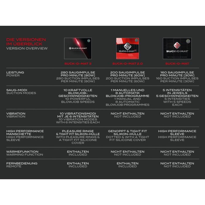 Mit einem robusten Gehäuse, hochwertigen Materialien und einem einfach zu reinigenden Ärmel ist dieses ein Gerät, das für intensiven Genuss und langanhaltenden Gebrauch gemacht ist. Ob du dich für tiefe Saugkraft, starke Vibrationen oder eine Kombination aus beidem entscheidest, der Suck-O-Mat 3 bietet alles für einen unvergesslichen, explosiven Höhepunkt.