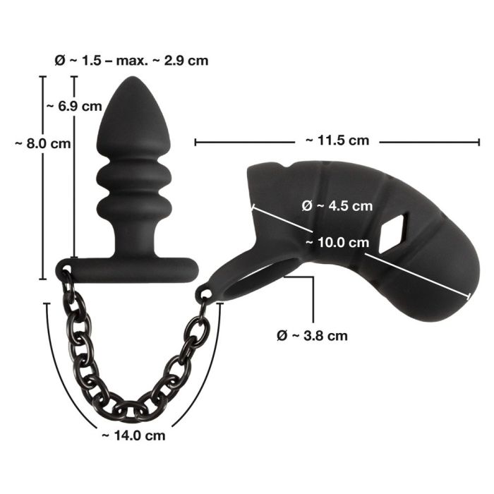Der Analplug, der eine Länge von 8 cm und eine Einführtiefe von 6,9 cm hat, bietet eine variable Durchmesser von 1,5 cm bis 2,9 cm, was ihn ideal für verschiedene Erfahrungsstufen macht. Die Soft-Touch-Textur des Silikons sorgt für ein angenehmes Tragegefühl, während die Belüftungsschlitze im Peniskäfig und die Öffnung zum Urinieren zusätzlichen Komfort bieten. Mit einem Gesamtgewicht von 104 g ist dieses Set leicht und handlich, perfekt für aufregende Abenteuer. Genießen Sie die perfekte Kombination aus Funktionalität und Ästhetik, die sowohl für Anfänger als auch für erfahrene Nutzer geeignet ist und Ihre Fantasien auf ein neues Level hebt.