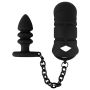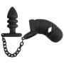Entdecken Sie das aufregende Rüstzeug für intensive Kontrolle und Keuschheitsspiele mit dem Cock Cage mit Butt Plug von Black Velvets. Dieses innovative Set kombiniert einen anatomisch geformten Peniskäfig aus hautfreundlichem Silikon mit einem dehnbaren Scrotalring und einem ausgeprägt geriffelten Analplug, die durch eine robuste Metallkette miteinander verbunden sind. Der Peniskäfig hat eine Länge von 11,5 cm und eine Einführtiefe von 10 cm, während der Scrotalring einen Durchmesser von 3,8 cm aufweist und sich dehnen lässt, um einen rutschfesten Sitz zu gewährleisten. Die Verbindungskette von 14 cm sorgt nicht nur für aufregenden Zug, sondern stimuliert auch den Damm während des Tragens, was das gesamte Erlebnis intensiviert.