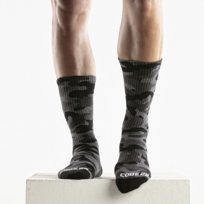De sokken hebben een stoere camouflage print in grijs tinten. Aan de zijkanten zijn witte sterren en strepen gedrukt en op de tenen is in het wit Code 22 gedrukt.