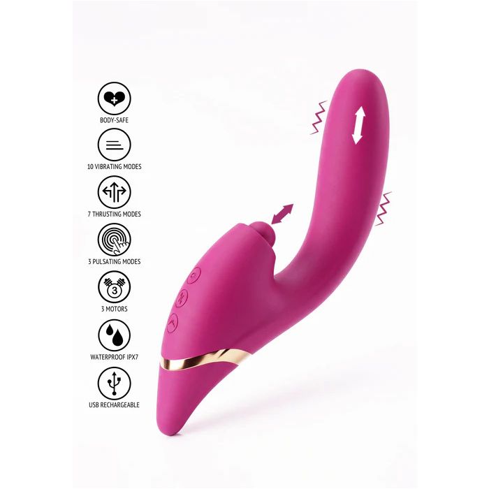 Der Drievoudige Vibrator Thrill Climaxer ist ein unwiderstehliches Spielzeug in einer verführerischen rosa Farbe. Dieser Vibrator bietet eine unvergleichliche dreifache Stimulation dank der drei leistungsstarken Motoren, die gemeinsam für ein intensives und aufregendes Erlebnis sorgen. Mit nicht weniger als 10 Vibrationsmodi und 7 Stoßmodi kannst du endlos experimentieren und die perfekte Kombination finden, die deine Sinne reizt. Der Schaft bewegt sich hinein und heraus, während er vibriert, was für ein tiefes und intensives Vergnügen sorgt. Darüber hinaus ist der klitorale Massager mit 3 tippenden pulsierenden Modi ausgestattet, die schnelle, rhythmische Pulse für gezielte externe Stimulation liefern. Dies macht den Thrill Climaxer ideal für sowohl Solo- als auch Paar-Vergnügen, sodass du zusammen oder allein ein unvergleichliches Erlebnis genießen kannst.