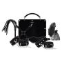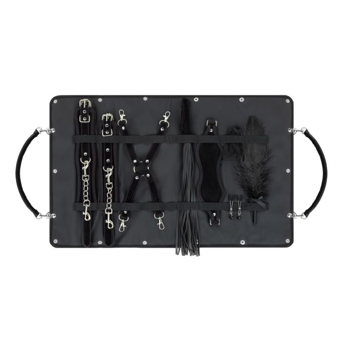 - Enthält Handschellen, Fußfesseln, Augenbinde, Peitsche, Tickler, Brustklemmen und Hogtie