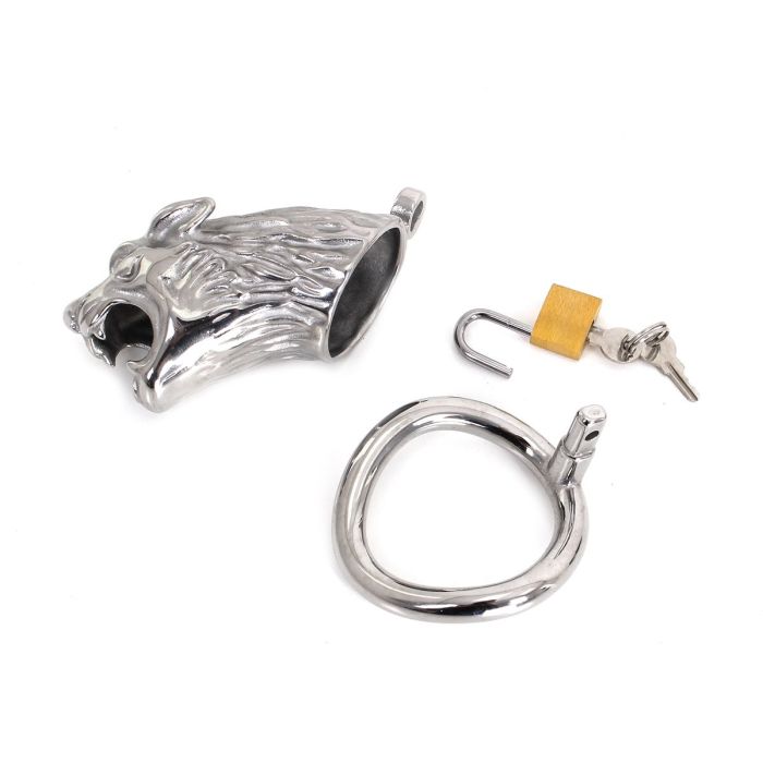 Deze leeuwenvorm peniskooi is zeer gemakkelijk in gebruik; plaat de kooi en de ring over zijn schacht en sluit af met het slotje. De ring heeft een diameter van 45 mm. Het is nu voor hem onmogelijk om een erectie te krijgen. Wil je hem nog verder kwellen? Dan begint het spel der verleiding en opwinding..
