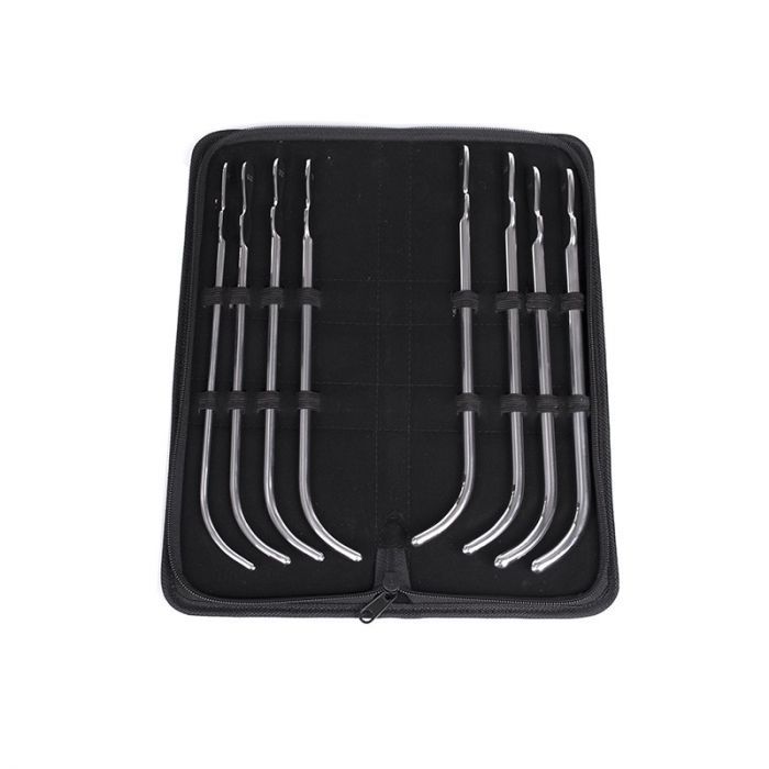 De Van Buren Urethral Sounds Set - Large van Kiotos is precies wat je nodig hebt! Deze hoogwaardige set, vervaardigd uit 100% roestvrij staal, biedt je maar liefst 8 J-vormige dilators in verschillende maten, zodat je altijd de perfecte pasvorm kunt vinden. Met een lengte van 28 cm zijn deze dilators speciaal ontworpen voor extra diepe prostaatstimulatie, waardoor je nieuwe hoogtes van genot kunt ontdekken.