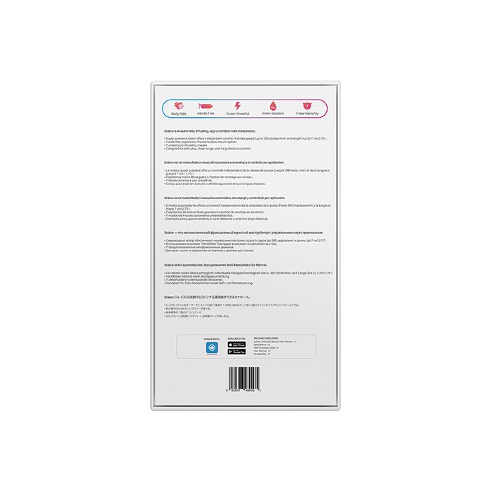 De zachte, genopte sleeve heeft een neutrale opening en kan gebruikt worden met glijmiddel op waterbasis. Met tot wel 280 stoten per minuut en een bewegingsbereik van 7 cm, biedt de Solace een intense ervaring.