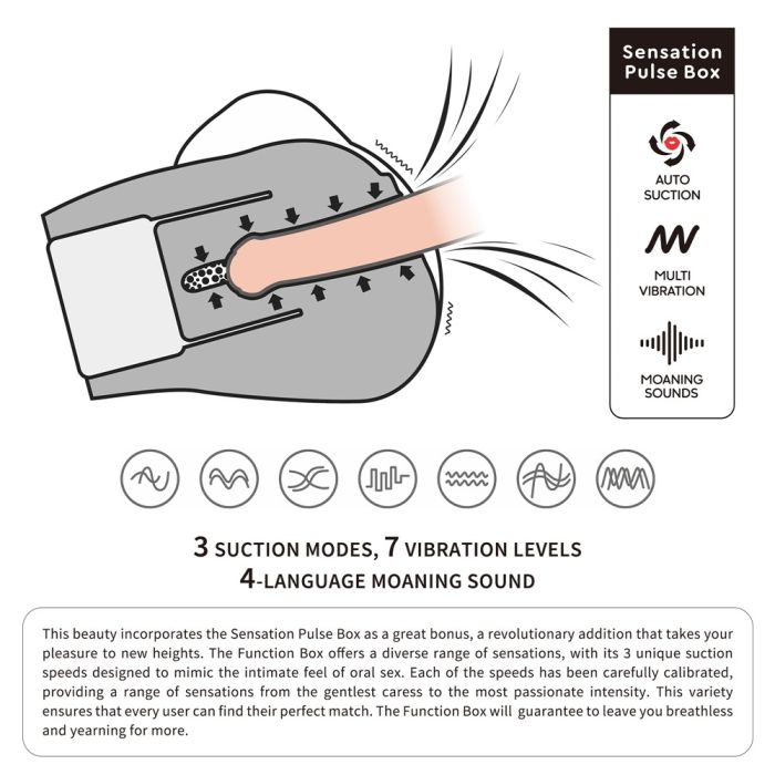 Lernen Sie den Streetgirl's Masturbator kennen, ein Meisterwerk, das Ihre intimen Erfahrungen in ungeahnte Höhen hebt. Dieses wunderschön gestaltete Genussgerät hat eine realistische, gespreizte Vagina, die Ihre Sinne vom ersten Moment an anregt. Mit Maßen von 20,4 x 24 x 14,5 cm und einem Gewicht von 2,67 kg ist diese elegante Schönheit gebaut, um über Jahre hinweg intensives Vergnügen zu bieten. Die Sensation Pulse Box, eine revolutionäre Ergänzung, bietet eine Vielzahl von Empfindungen mit drei einzigartigen Saugstärken, die das intime Erlebnis von Oralsex perfekt nachahmen. Ob Sie eine sanfte Streicheleinheit oder einen leidenschaftlichen Höhepunkt suchen, diese Funktion garantiert, dass Sie jedes Mal außer Atem geraten und nach mehr verlangen. Mit realistischen Stöhngeräuschen und sieben Vibrationsmodi sorgt die Sensation Pulse Box für ein wahrhaft umwerfendes Erlebnis. Und die Reinigung? Ein Kinderspiel! Entfernen Sie einfach die Sensation Box, spülen Sie den Kanal mit fließendem Wasser ab und Sie sind bereit für das nächste Abenteuer. Vergessen Sie nicht, ausreichend Gleitmittel zu verwenden, um ein müheloses Erlebnis zu gewährleisten. Das ist der ultimative Weg, um sich selbst zu verwöhnen!