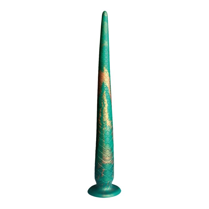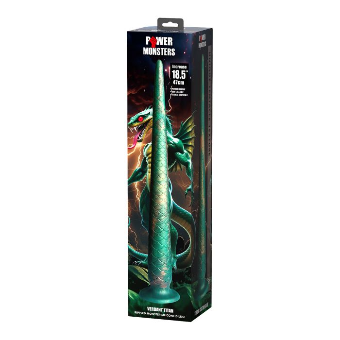 De Monster Dildo Power Monsters Verdant Titan - een mythische creatie die je stoutste verlangens tot leven brengt. Met een indrukwekkende lengte van 47 cm en een lichaam dat bedekt is met gedetailleerde smaragdgroene schubben en subtiele gouden accenten, is deze dildo niet alleen een lustobject, maar ook een waar kunstwerk. De taps toelopende punt zorgt voor een gemakkelijke en comfortabele inbreng, terwijl de sterke zuignap je avontuur stevig verankert, zodat je vrij kunt experimenteren. Dit meesterwerk combineert een gedurfde uitstraling met krachtige functionaliteit, perfect voor degenen die durven te spelen met fantasie en sensatie. Bereid je voor op onvergetelijke avontuurlijke genotservaringen met deze indrukwekkende, fantasierijke en krachtige dildo!