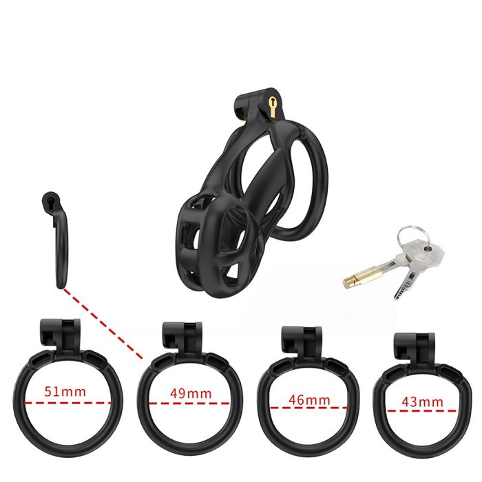 Sie können zwischen verschiedenen Durchmessern wählen, nämlich 43 mm, 46 mm, 49 mm und 55 mm, um die beste Passform zu finden, die zu Ihnen passt. Der CELLMATE Guardian Keuschheitskäfig wird sowohl mit einem traditionellen Metallschloss mit 2 Schlüsseln als auch mit einem speziellen ABS-Kunststoff-Adapterpin geliefert, mit dem Sie den Käfig im Stealth-Modus mit einem der fünf Plastikhängeschlösser schließen können, die jeweils mit einem einzigartigen betrugssicheren Identifikationscode versehen sind.