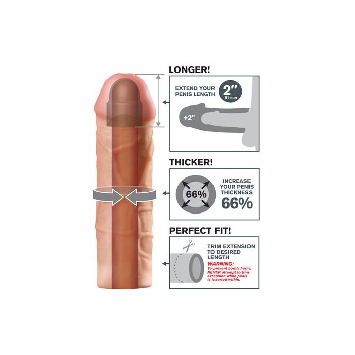 Mit der Fantasy X-tensions Mega 2 Verlängerung wird Ihr Penis sofort in ein großartiges Erlebnis für Ihren Partner verwandelt. Ein Eingriff ist ab sofort nicht mehr nötig. Denn dies ist erschwinglich und sicher in der Anwendung. Es ist eine anpassbare Verlängerung, die einfach zugeschnitten werden kann. Es hat einen Innendurchmesser von 3,2 cm, eine Länge von 20,3 und eine Breite von 5 cm. Kurz gesagt, Ihr Leben wird sich mit der Fantasy X-tensions Mega 2 Verlängerung ändern.