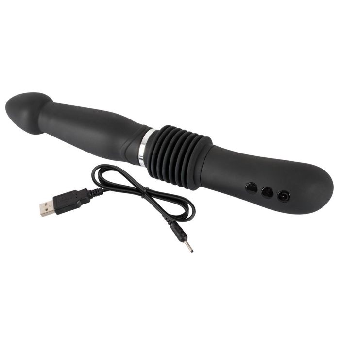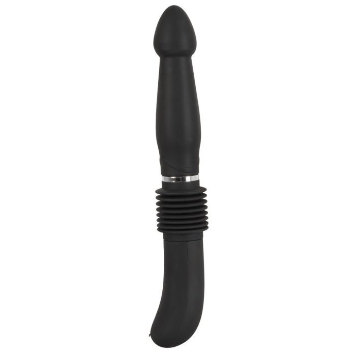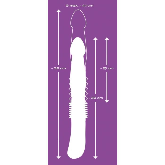 Wenn du den Vibrator in den Händen hast, siehst du den Abdeckmantel mit Falten in der Mitte, unter dem sich das Herz dieses Vibrators befindet, nämlich die Stoßfunktion. Drücke auf die Bedienung am Griff und du wirst entdecken, dass der Schaft um beeindruckende 6,3 cm ausfährt. Wenn du den Vibrator einfach in deinen Händen hältst, siehst du, wie schön der Push It Vibrator auf und ab Bewegungen macht, doch es wird erst richtig spannend, wenn du diesen Vibrator einführst. Die Stoßfunktion ist mit 3 Geschwindigkeiten ausgestattet und dank des praktischen Handgriffs hast du immer die volle Kontrolle über den stoßenden Push It analer Vibrator