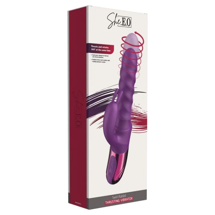 Der Swirl Rabbit Thrusting Vibrator von She.EO ist ein revolutionäres Lustspielzeug, das speziell für Frauen entwickelt wurde, die nach einer tieferen, rhythmischen Stimulation verlangen. Mit seinem einzigartig einführbaren Schaft bietet dieser Vibrator ein unvergleichliches Gefühl durch Auf- und Abstoßen und gleichzeitiges 360°-Drehen um seine Achse. Wählen Sie aus nicht weniger als 5 verschiedenen Rotationsmodi – zwei, die nach links drehen, zwei nach rechts und einen, der mühelos zwischen beiden Richtungen wechselt. Kombinieren Sie dies mit 5 kraftvollen Stoßintensitäten und Sie erleben lebensechte Bewegungen, die Ihr Vergnügen in ungeahnte Höhen treiben.