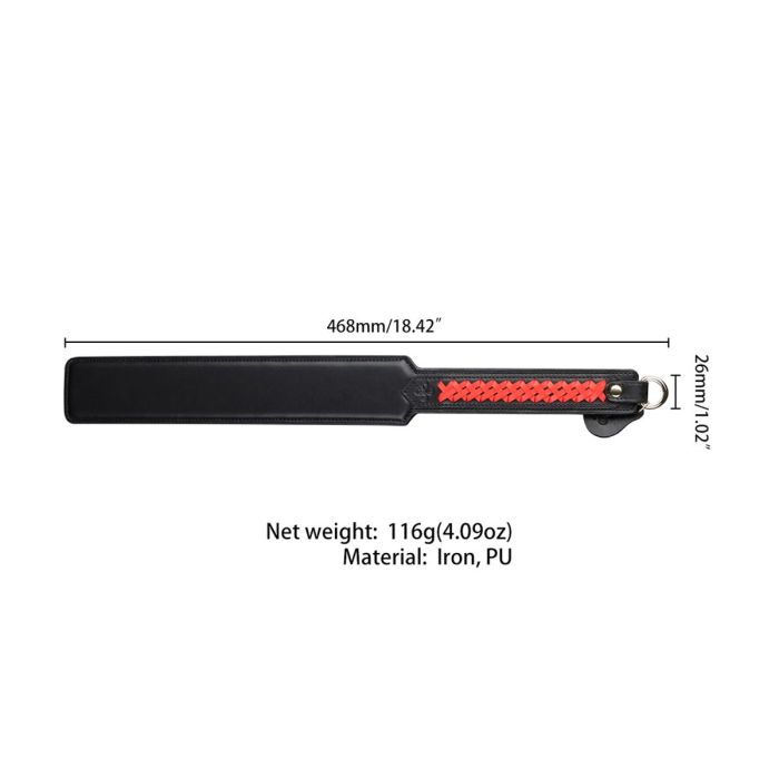 Dit prachtig ontworpen accessoire is niet alleen een lust voor het oog, maar ook een must-have voor elke liefhebber van sensuele spelletjes. Met zijn strakke zwarte afwerking en de opvallende rood gevlochten handgreep, voegt deze paddle een vleugje elegantie toe aan je collectie.