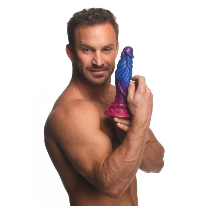 Der XR Brands Alien Dildo ist ein fantasievolles Sexspielzeug, das sofort durch seine kosmische Farbkombination aus Blau, Lila und Rosa mit glitzernden Details, die einen Sternenhimmel nachahmen, auffällt. Das einzigartige Design mit Beulen, seilartigen Linien und einer dicken Kante bietet intensive Stimulation und erhöht das Vergnügen bei jeder Bewegung.