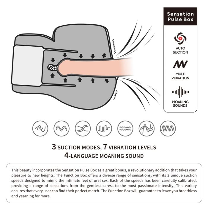 Maak kennis met de Streetgirl's Masturbator, een meesterwerk van design en functionaliteit dat je intieme ervaringen naar ongekende hoogten tilt. Dit genotsapparaat is niet alleen prachtig vormgegeven met een realistische, gespreide vagina, maar het wordt ook geleverd met de verleidelijke Boudoir string die je zintuigen prikkelt vanaf het moment dat je het in gebruik neemt. Met afmetingen van 19,7 x 20 x 14 cm en een gewicht van 2,52 kg, is deze elegante body ontworpen om jarenlang intens genot te bieden. De Sensation Pulse Box, een revolutionaire toevoeging, biedt een scala aan sensaties met drie unieke zuigsnelheden die de ervaring van orale seks perfect nabootsen. Of je nu op zoek bent naar een zachte streling of een passionele intensiteit, deze functie zorgt ervoor dat je altijd de juiste match vindt. Met realistische kreungeluiden en zeven vibratiestanden, garandeert de Sensation Pulse Box een werkelijk verbluffende ervaring die je keer op keer in vervoering zal brengen. Het onderhoud van dit luxe apparaat is eenvoudig; verwijder de Sensation Box en spoel het kanaal af met stromend water. Voor een optimale ervaring raden we aan om voldoende glijmiddel te gebruiken, zodat je moeiteloos kunt genieten van elk gebruik. Druk herhaaldelijk om te schakelen tussen verschillende talen en laat je meevoeren in een wereld van genot!