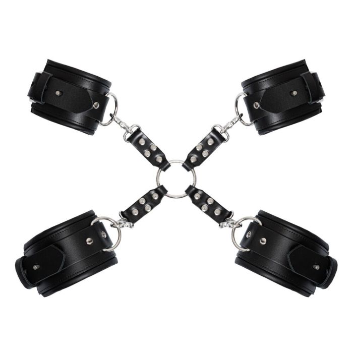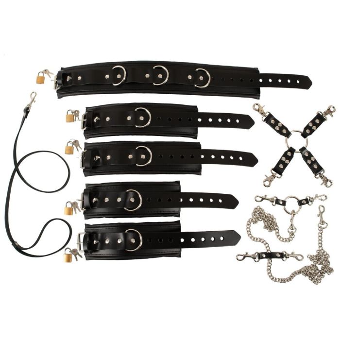 De Zado Professionele Complete Bondage Bevestigingsset is de ultieme keuze voor liefhebbers van professionele bondagespellen! Deze hoogwaardige set is vervaardigd uit luxe zwart leer en is voorzien van stijlvolle zilverkleurige accessoires. De set omvat een nekboei met riem, handboeien, enkelboeien, een hogtie en een lange karabijnketting, zodat je eindeloos kunt experimenteren met verschillende bondageposities. Met vier goudkleurige sloten en sleutels voor extra veiligheid, ben je verzekerd van een spannende en veilige ervaring.